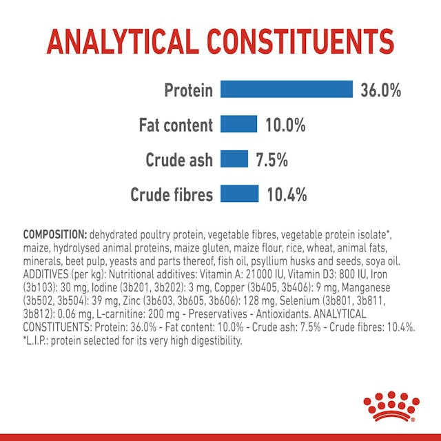 غذای رویال کنین رژیمی گربه حاوی پروتئین طیور خشک ، الیاف گیاهی ، پروتئین گیاهی جدا شده ، ذرت ، پروتئین حیوانی هیدرولیز ، گلوتن ذرت ، آرد ذرت ، برنج ، گندم ، چربی های حیوانی ، معدنی ، خمیر چغندر ، مخمرها و قطعات آن ، روغن ماهی ، پوسته های پسیلیم و دانه ، سویا روغن پروتئین LIP به دلیل قابلیت هضم بسیار بالای آن انتخاب شده است. ویتامین A ، ویتامین D3 ، آهن ، ید ، مس ، منگنز ، روی ، سلنیوم – مواد نگهدارنده – آنتی اکسیدان ها.