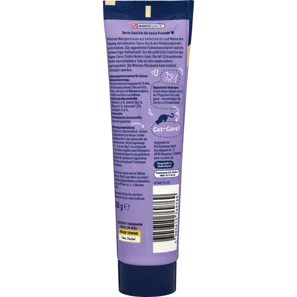 روغنهای گیاهی موجود در خمیر مالت وینستون، به نرمی و لطافت پوست و مو کمک کرده و باعث درخشندگی و شادابی آنها میشود. با استفاده منظم از خمیر مالت وینستون آنتی هربال، میتوانید از بروز مشکلات گوارشی ناشی از تجمع گلولههای مو در گربه خود جلوگیری کرده و به سلامت پوست و موی او کمک کنید. این محصول به ویژه برای گربههایی با موهای بلند و پر پشت و همچنین گربههایی که در فصل ریزش مو هستند، بسیار مفید است